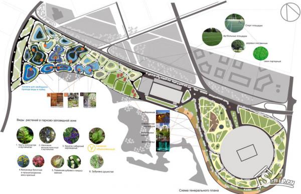 Его главное отличие от остальных проектов - при строительстве парка акцент будет сделан на сохранении городской экологии. Для этого на территории парка сохранят десятки растений, занесенных в Красную книгу. Территорию площадью 70 гектар разделят на две части - зону отдыха, где высадят редкие растения и разобьют озера и зону, где можно будет заниматься спортом. В парке построят велодорожки и футбольные площадки.
