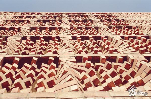 Пористый кирпичный экран создан из повторяющихся поворотных кубических модулей, пропускающих воздух и естественный дневной свет, фильтрует их и создает аутентичную архитектурную динамику выразительной структуры.