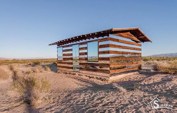 В Калифорнийской пустыне появилась любопытная инсталяция по проекту художника Phillip K Smith III. Оптическая иллюзия была достигнута за счет установленных на фасаде зеркал. Таким образом создается впечатление, что деревянные элементы конструкции будто парят в воздухе. Название проект получил “Lucid Stead”.