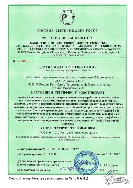 В ноябре 2009г. органом по сертификации «РОССЕРТ» (г. Казань) в ООО «Магнолия-С» проведена ресертификация системы менеджмента качества применительно к разработке, производству и поставке отливок из алюминиевых сплавов, изделий мехобработки для различных отраслей промышленности; проектированию средств технологического оснащения; осуществлению управляющих действий по организации строительства и монтажа объектов строительства; строительству зданий и сооружений I и II уровней ответственности; оказанию бухгалтерских, юридических, кадровых и маркетинговых услуг; предоставлению консультационных услуг по разработке, внедрении систем менеджмента и методов самооценки; оптовой и розничной торговли на соответствие требованиям ГОСТ Р ИСО 9001-2008 (ИСО 9001-2008) и получен сертификат соответствия № РОСС RU.ИК79. К00129 от 30.11.2009 г., что даёт преимущество перед конкурентами при участии в тендерных торгах; расширение рынков сбыта; увеличение инвестиционной привлекательности; повышение имиджа компании в глазах партнеров; повышение ответственности и дисциплинированности персонала; повышение качества продукции (услуг); облегчение взаимодействия с государственными структурами.
