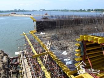 Активные работы ведутся на строительстве временной насыпной дамбе от Ленинской дамбы до Кремлевской Набережной. Строители уже возвели часть опор будущего моста и начали вязать арматуру пролета через реку.